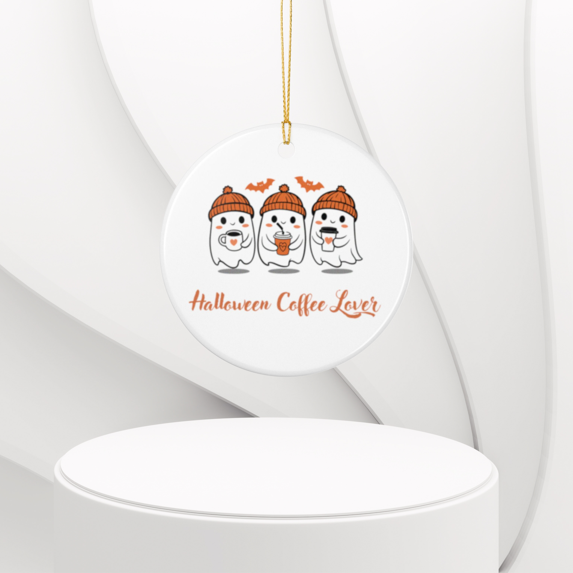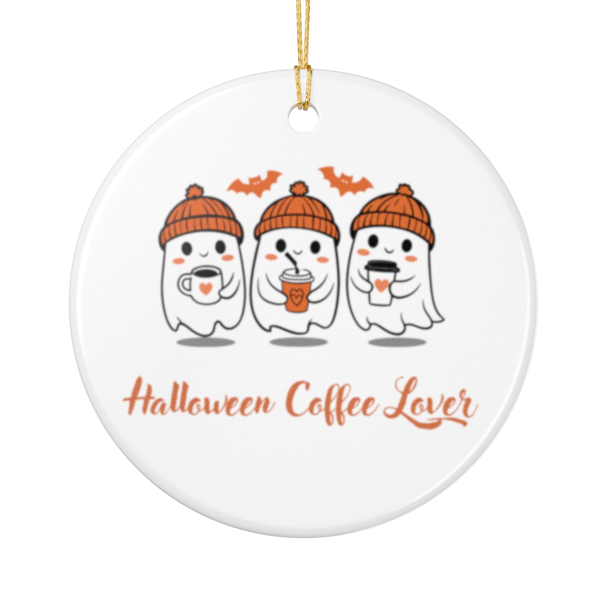 Fun and formal Halloween ornament made of white ceramic with a glossy finish and matte print. Includes a gold string for hanging. Perfect for Halloween decorations and adding a festive touch to your home. Ideal for Halloween enthusiasts and those who love to decorate for the holiday.